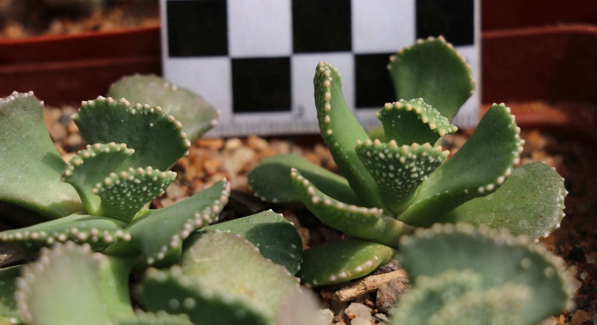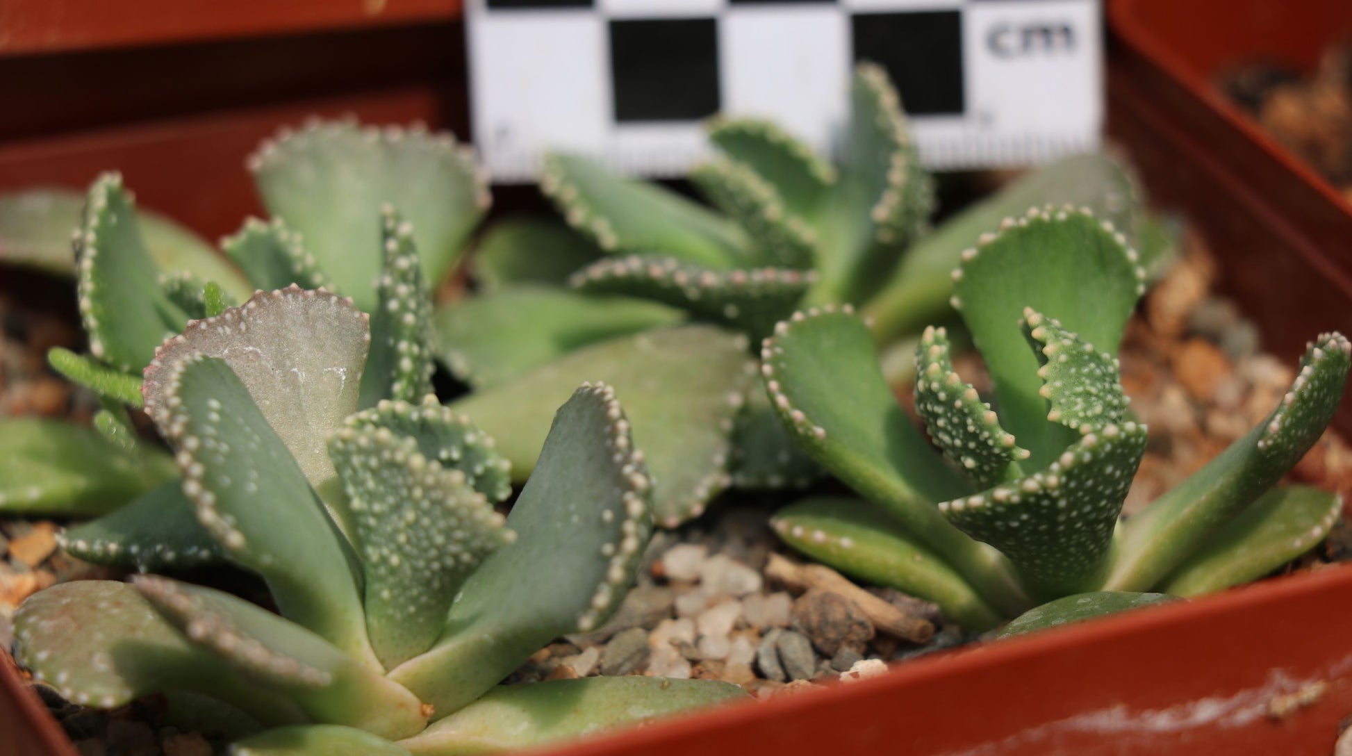 A striking, clump forming Mesemb with flat, triangular leaves adorned with a range of warts. They occur naturally in the vicinity of Loeriesfontein in the Northern Cape. These plants are very hardy, require little water throughout the year and can also handle substantial frost. Your plant will consist of a single cluster with several leaves.