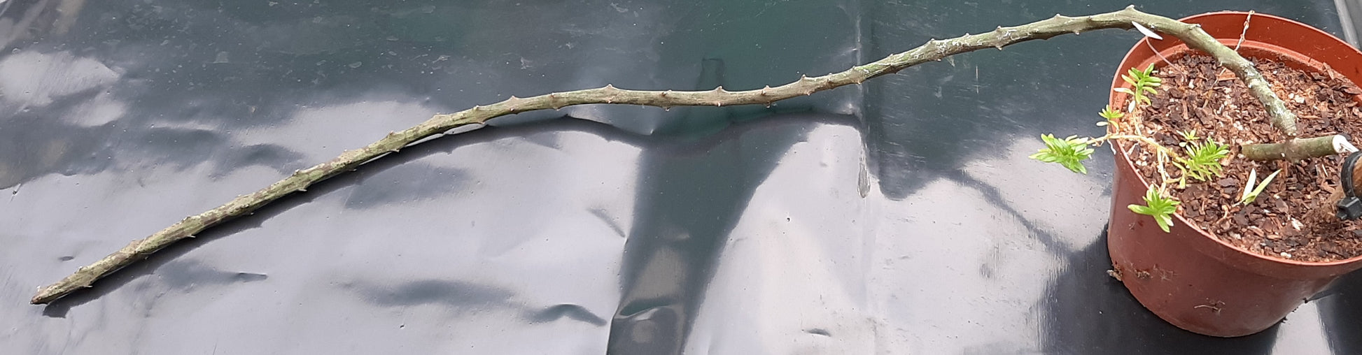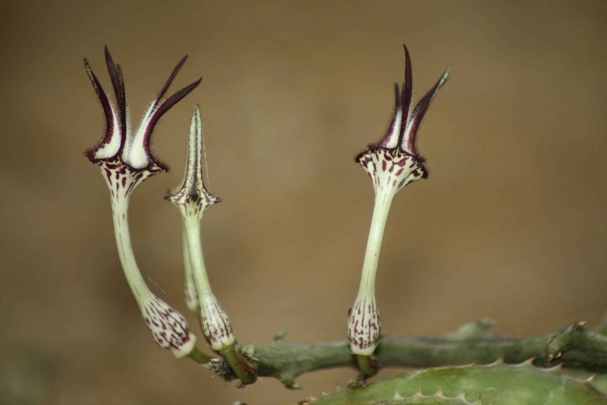 A unique and rare plant with some of the most exotic and beautiful flowers! A creeping to climbing plant with succulent stems up to 10 mm thick. Flowers are produced throughout summer at the growing tip of stems. The species is native to the Eastern Cape where it climbs through dense thicket vegetation. Reported to be more difficult to grow, though we have little problems with it. Keep the the roots and lowers stems in shadier spot while allowing the trailing stems to reach sunlight - this will also promote flowering. Best grown in hanging baskets or trained along a trellis. Water well during summer and reduce watering during winter. Plants being offered are already quite large, with a minimum stem length of 30 cm.
