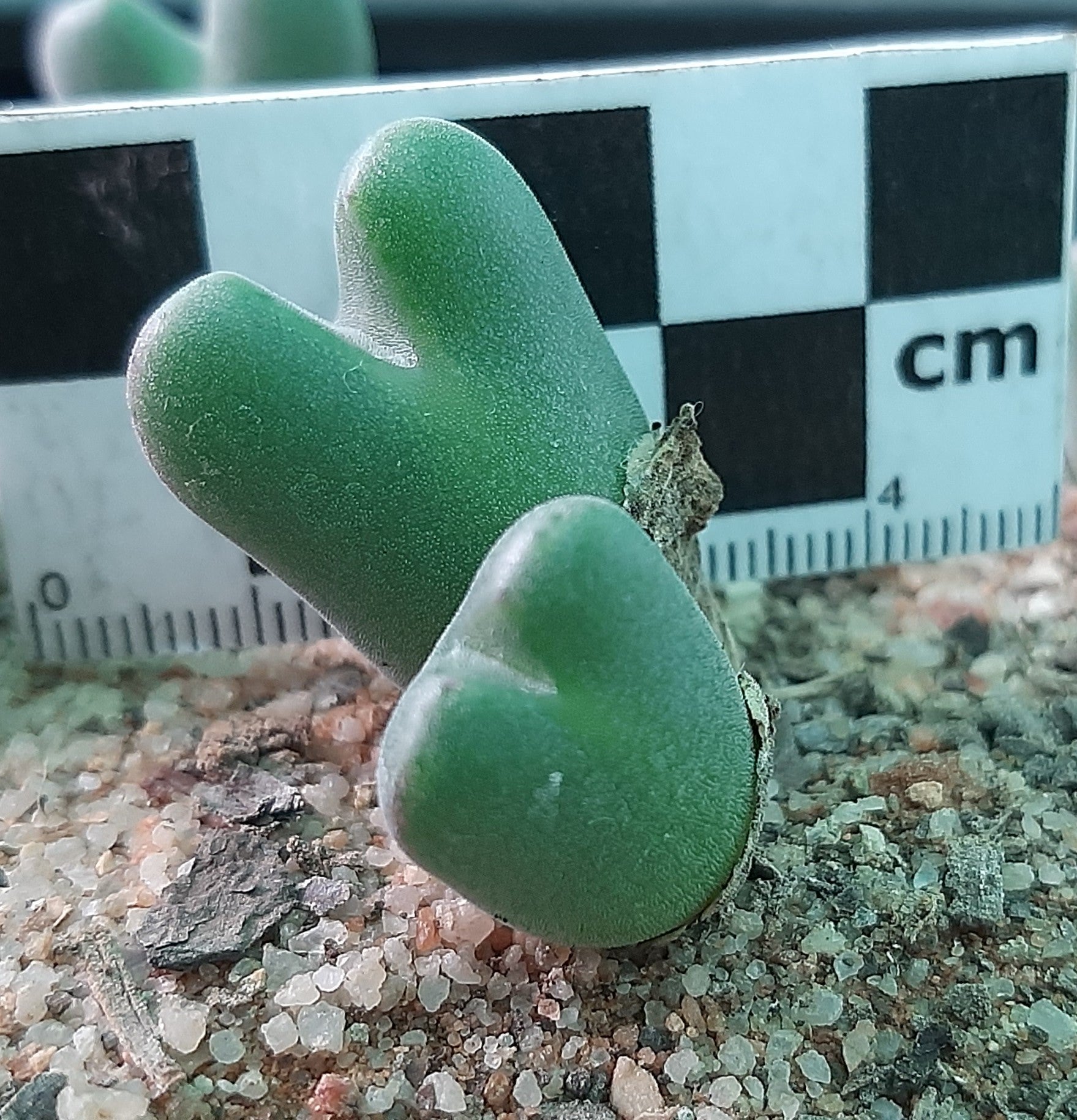 A small species with elongated, bilobed leaves with red markings growing in strong sunlight. It can form a sizable dome (20 cm diameter) over time. Known from the area of Arondegas. It produces pink flowers in autumn. Each plant will contain a minimum of two heads. A summer dormant species growing actively during winter, we will provide you with detailed cultivation tips for successfully growing Conophytums.