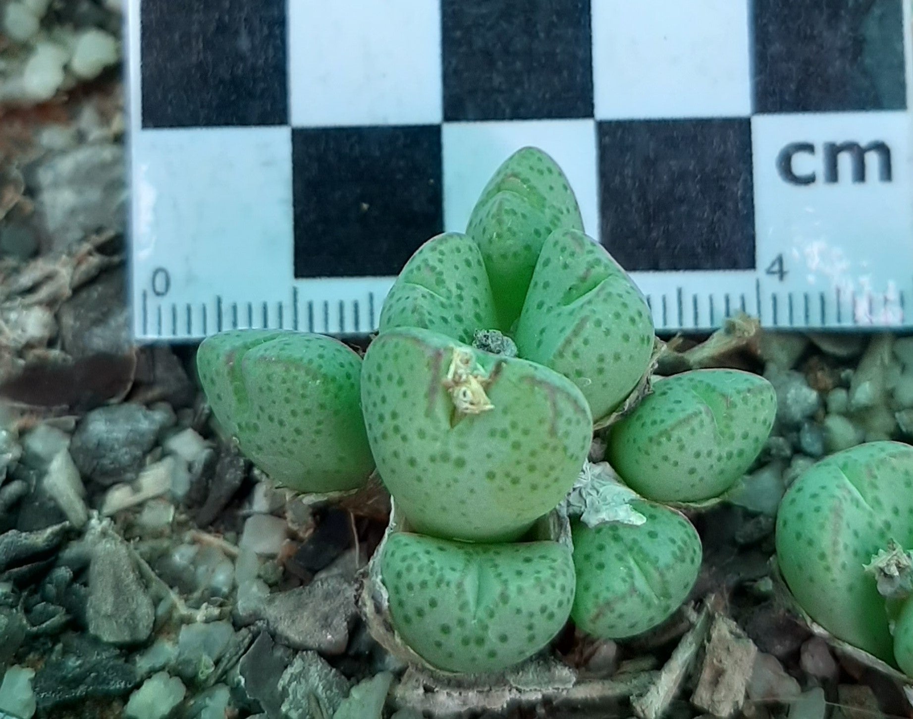 A small, dome forming species with keeled and spotted heads producing small, yellow, sweetly scented, nocturnal flowers in autumn. A relatively rare species known from the Heioab Mountain in Namibia. Each plant will contain a minimum of four heads. A summer dormant species growing actively during winter, we will provide you with detailed cultivation tips for successfully growing Conophytums.