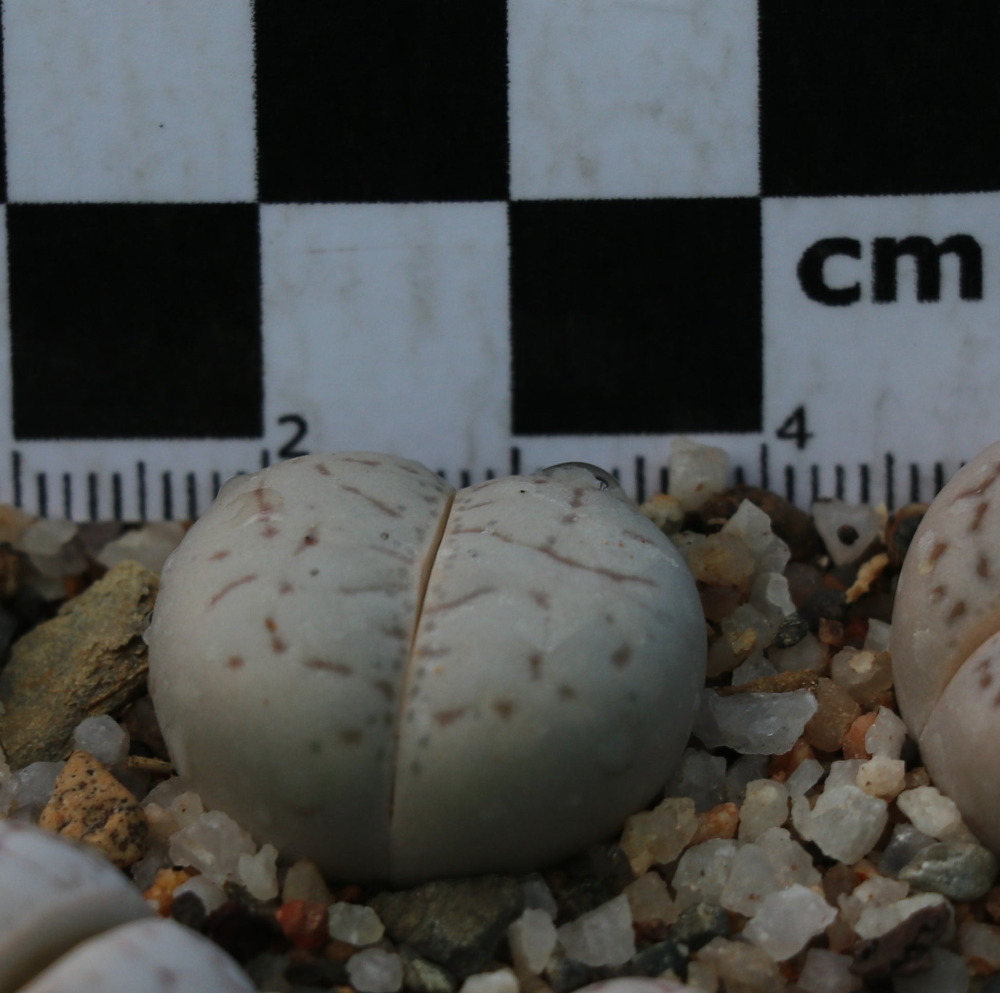 A unique, stone-like plant that closely resembles the better known Lithops, but is not closely related to it. It can grow to have fairly large heads (about 6 cm diameter) and with up to 10 heads. Plants are white, with reddish lines. It is quite rare, bot in nature and in trade and is not often seen for sale. The species occurs naturally in the extremely arid Bushmanland. Not as easy to grow as Lithops, but easily kept if its main requirements are met, almost all day direct sun and light watering from September to April. Plants being offered are adult plants, with a diameter of about 2 to 4 cm.