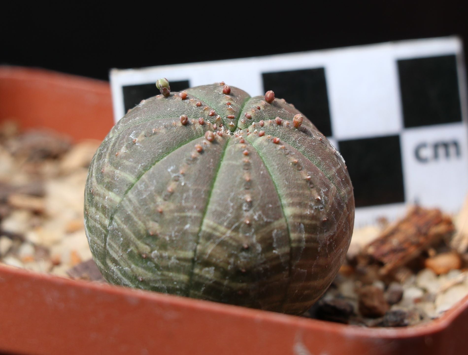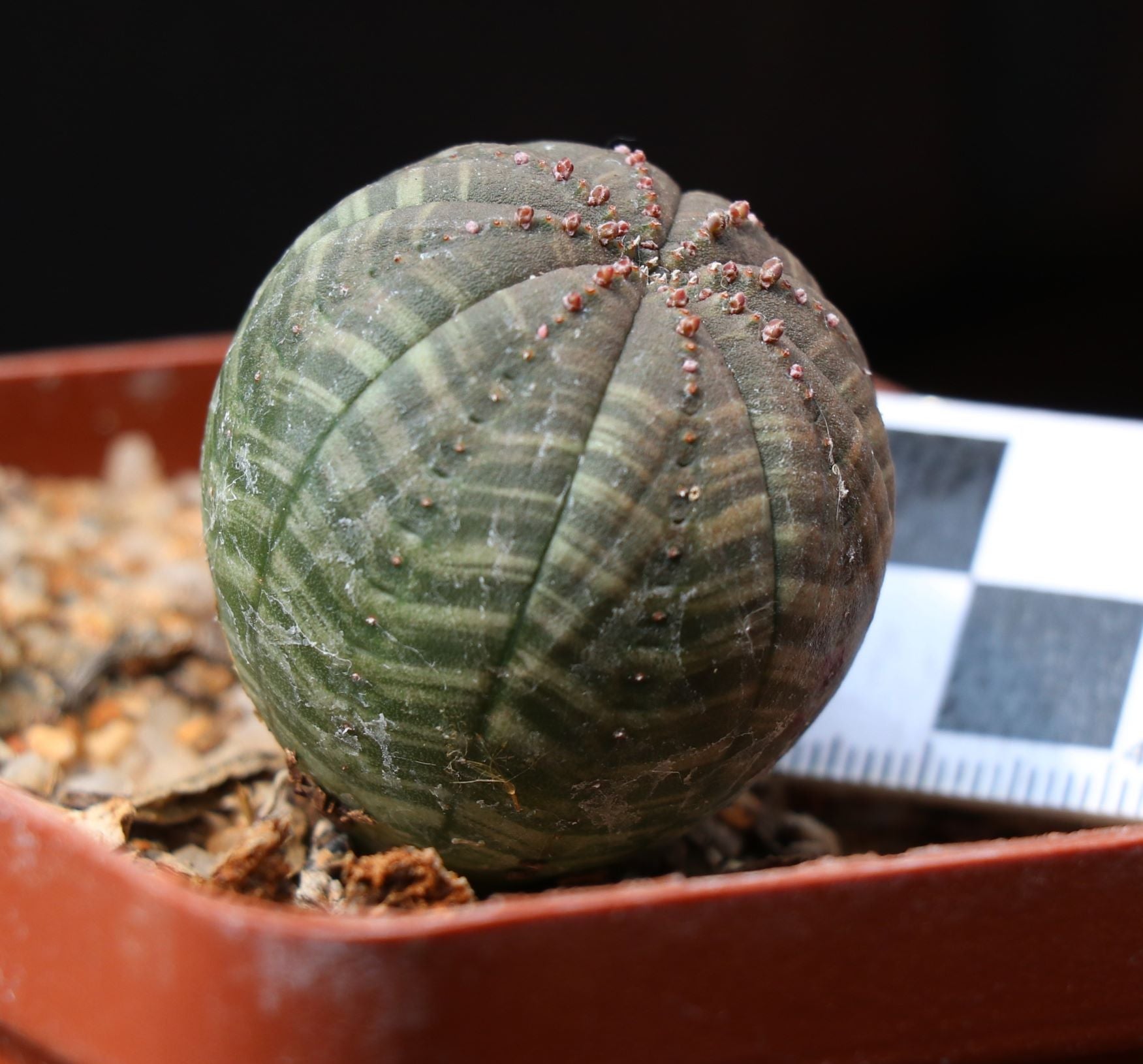 Remarkable and immediately recognizable, Euphorbia obesa can grow up to 20 cm in height and 10 cm in diameter. These are fairly easy to grow, require only little water throughout the year and can also take moderate frost. These are seed grown plants, with required TOPS permits (in addition to our standard nursery permits). Your plant will already be substantial with a minimum diameter of 3 cm and has already started flowering. We are making these available at a very affordable price.