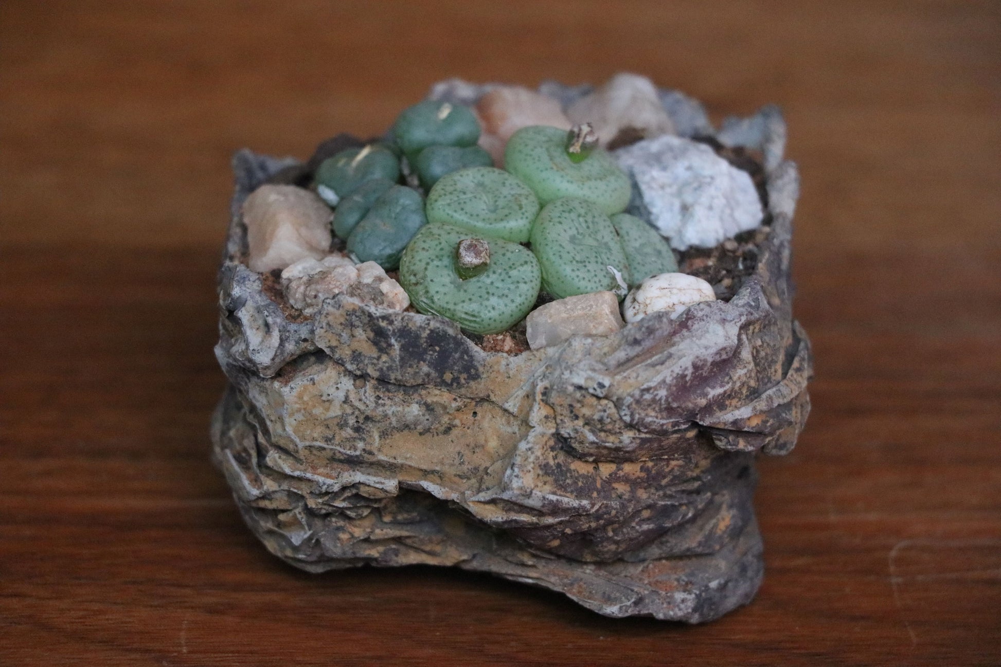 Small handmade pots which resemble the natural habitat of these dwarf succulents. Ideal for a desk, windowsill or outside patio. Pots have a diameter of 10 cm. These are handmade and each pot will be unique with subtle differences in texture and colour between each pot. These pots are unglazed and will change colour over time. Plants are for illustration only and are sold separately.